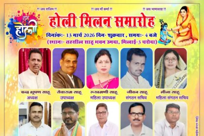 भिलाई। जिला साहू संघ भिलाई नगर के तत्वावधान में होली के पावन पर्व के अवसर पर होली स्नेह मिलन समारोह का आयोजन किया जा रहा है। यह कार्यक्रम 13 मार्च 2026, शुक्रवार को शाम 4 बजे से तहसील साहू संघ भिलाई–3 चरोदा में आयोजित होगा।इस स्नेह मिलन समारोह में जिला साहू संघ भिलाई नगर के अधीनस्थ सभी तहसील, परिक्षेत्र एवं…