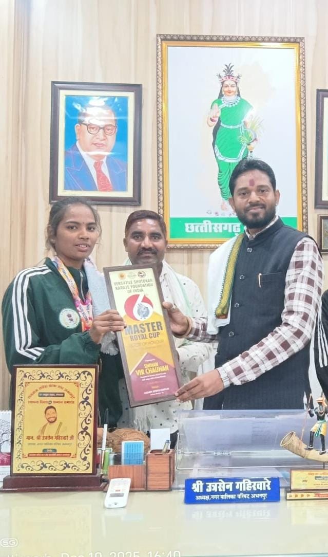 अभनपुर।CG NEWS: मुंबई, महाराष्ट्र में आयोजित मुम्बई मास्टर रॉयल कप ऑल इंडिया कराटे चैंपियनशिप 2025 में छत्तीसगढ़ की होनहार खिलाड़ी सुमन साहू ने शानदार प्रदर्शन करते हुए गोल्ड और सिल्वर मेडल अपने नाम किए हैं, जिससे पूरे प्रदेश का नाम राष्ट्रीय स्तर पर रोशन हुआ है। इस ऐतिहासिक जीत के बाद अभनपुर लौटने पर नगर पालिका अध्यक्ष उत्रसेन गहिरवारे ने सुमन साहू को सम्मानित कर उनकी हौसला अफजाई की और इसे क्षेत्र के युवाओं के लिए प्रेरणास्रोत बताया। सुमन साहू ने अपनी इस बड़ी उपलब्धि का श्रेय अपने कोच बरखा राजपूत के मार्गदर्शन, कठिन प्रशिक्षण और परिवार के सहयोग को दिया है, वहीं इस सफलता से खेल प्रेमियों और स्थानीय लोगों में खासा उत्साह देखने को मिल रहा है।