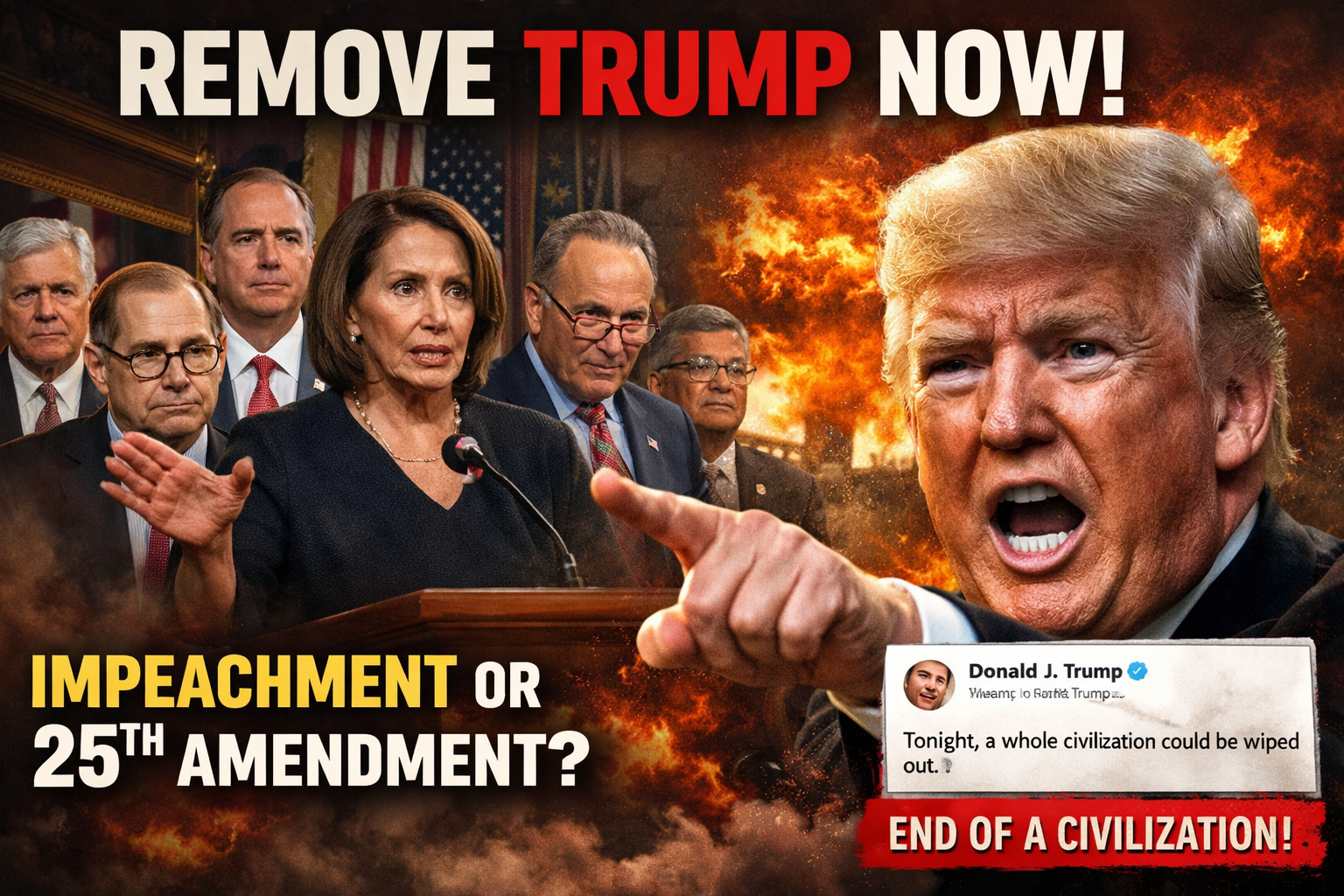 लेंस डेस्क। अमेरिकन कांग्रेस में डेमोक्रेट्स के बीच राष्ट्रपति डोनाल्ड ट्रम्प (Donald Trump) को पद से हटाने की मांग मंगलवार को चरम पर पहुंच गई, जब उन्होंने ईरान के बारे में एक पोस्ट में धमकी दी, ‘आज रात एक पूरी सभ्यता का अंत हो जाएगा।’ कानून निर्माता खुले तौर पर महाभियोग या 25वें संशोधन के माध्यम से पद से हटाने की बात कर रहे हैं।