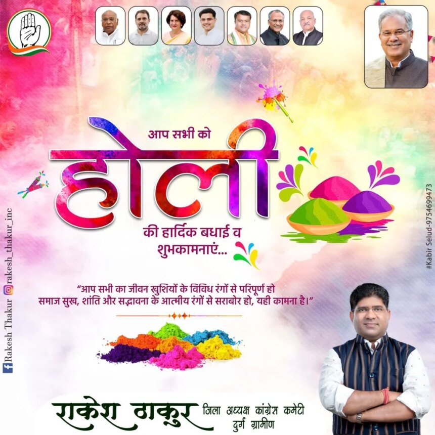 दुर्ग। जिला कांग्रेस कमेटी दुर्ग ग्रामीण के जिलाध्यक्ष राकेश ठाकुर ने प्रदेशवासियों को रंगों के पावन पर्व होली की हार्दिक बधाई एवं शुभकामनाएं दी हैं।