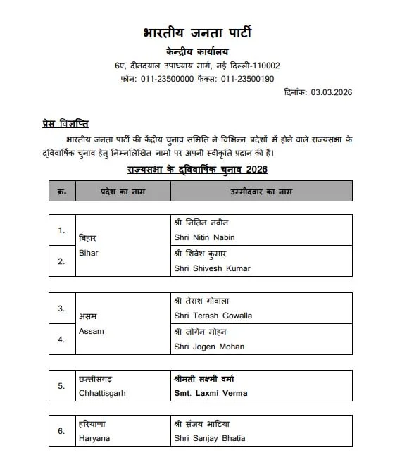 भाजपा के मुख्याल प्रभारी महासचिव अरुण सिंह ने छततीसगए़ के साथ ही अन्य राज्यों के लिए भी उम्मीदवारों का ऐलान कर दिया है। दूसरे राज्यों से जिनको उम्मीदवार बनाया गया है उनमें इनके नाम शामिल है- Nitin Nabin, Shivesh Kumar from Bihar. Terash Gowalla, Jogen Mohan from Assam. Laxmi Verma from Chhattisgarh. Sanjay Bhatia from Haryana. Manmohan Samal, Sujeet Kumar from Odisha Rahul Sinha from West Bengal।