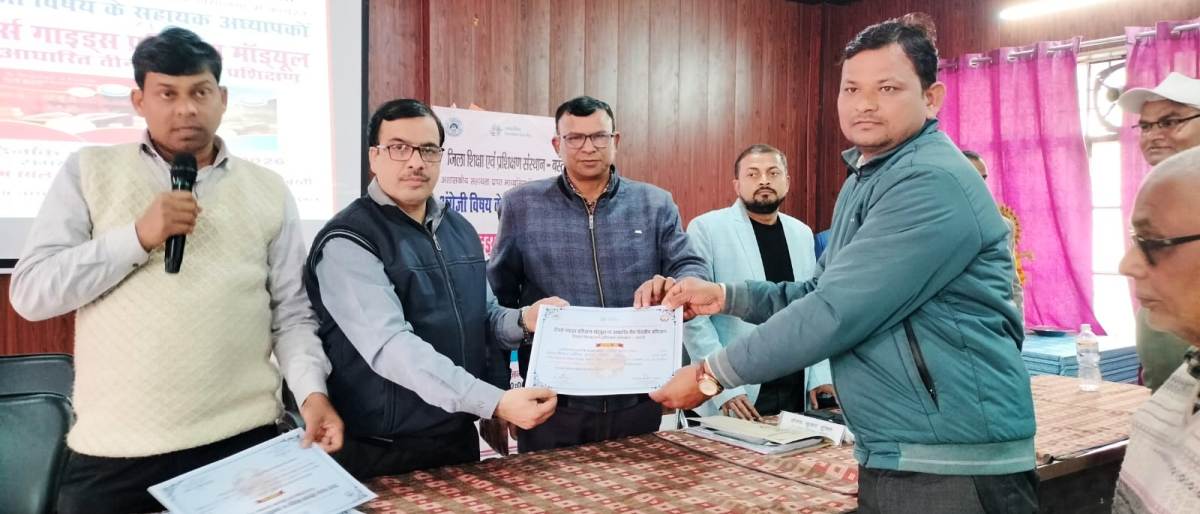 बस्ती – जिला शिक्षा एवं प्रशिक्षण संस्थान में डायट प्राचार्य संजय कुमार शुक्ल के निर्देशन में चल रहे टीचर्स गाइड्स मॉड्यूल पर आधारित तीन दिवसीय प्रशिक्षण गुरुवार को सम्पन्न हुआ। जिसमें जनपद के अशासकीय सहायता प्राप्त माध्यमिक विद्यालय में कार्यरत अंग्रेजी विषय के शिक्षकों ने प्रतिभाग किया। सभी प्रतिभागी शिक्षकों को प्रमाण पत्र वितरित कर प्रशिक्षण का समापन किया गया। डायट प्राचार्य संजय कुमार शुक्ल ने बताया कि इस प्रशिक्षण का उद्देश्य शिक्षकों के ज्ञान, कौशल और क्षमता को बढ़ाना है ताकि वे नई शिक्षण विधियों का प्रभावी ढंग से उपयोग कर सकें। प्रशिक्षण के नोडल डायट प्रवक्ता डॉ रविनाथ त्रिपाठी ने कहा कि इस प्रशिक्षण का उद्देश्य बेहतर शिक्षा सुनिश्चित करने के लिए शिक्षकों में तर्कसंगत विचार, चिंतन और शिक्षण कौशल का विकास करना है।