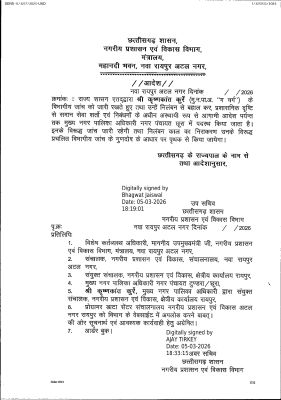 रायपुर, 5 मार्च। नगरीय प्रशासन एवं विकास विभाग ने निलंबित दो कर्मचारियों को बहाल किया है। जारी आदेशानुसार ममता चौधरी को सीएमओ लैलूंगा, कृष्ण कांत कुर्रे को सीएमओ छूरा पदस्थ किया गया है। इनमें एक लिपिक है।