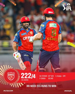 मुल्लांपुर, 28 अप्रैल । पंजाब किंग्स ने इंडियन प्रीमियर लीग में मंगलवार को यहां राजस्थान रॉयल्स के खिलाफ चार विकेट पर 222 रन बनाए।