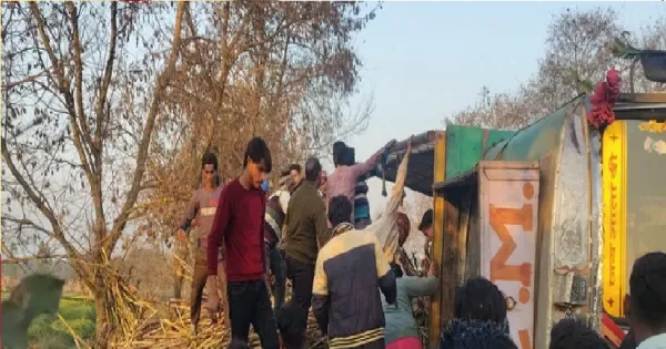 पीलीभीत । उत्तर प्रदेश के हाफिजगंज थाना क्षेत्र में पीलीभीत हाईवे पर शुक्रवार शाम करीब पांच बजे एक भीषण सड़क हादसा हो गया। गन्ने से भरा एक अनियंत्रित ट्रक सामने से आ रही कार के ऊपर पलट गया, जिससे कार पूरी तरह दब गई। ट्रक के पलटते ही उस पर लदा सारा गन्ना कार पर आ गिरा और मौके पर चीख-पुकार मच गई।