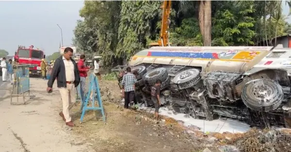 जलपाईगुड़ी। सिलीगुड़ी-जलपाईगुड़ी नेशनल हाईवे पर फुलबाड़ी संलग्न जियागंज इलाके में रविवार को अनियंत्रित होकर एक पेट्रोल टैंकर पलट गया। घटना से इलाके में दहशत का माहौल देखा गया। बताया जा रहा है कि सिलीगुड़ी से जलपाईगुड़ी की ओर जाते समय पेट्रोल टैंकर अचानक बेकाबू होकर सड़क किनारे गड्ढे में पलट गया। टैंकर पलटने से इलाके में अफरा-तफरी मच गई। सूचना मिलने पर न्यू जलपाईगुड़ी थाने की पुलिस मौके पर पहुंची। गाड़ी में भारी मात्रा में पेट्रोल भरा होने की वजह से आग लगने का खतरा था। फुलबाड़ी से दो फायर इंजन मौके पर पहुंचकर हालात को संभाला। हादसे में गाड़ी का चालक मामूली रूप से घायल हो गया। हालांकि, टैंकर पलटने से नेशनल हाईवे के एक हिस्से पर ट्रैफिक जाम हो गया। खबर लिखे जाने तक, पुलिस गाड़ी को गड्ढे से निकालने की कोशिश कर रही थी।