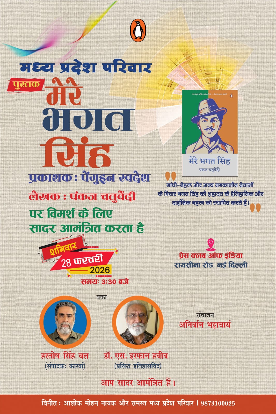 नई दिल्ली। मध्य प्रदेश परिवार द्वारा आयोजित एक साहित्यिक कार्यक्रम में वरिष्ठ लेखक पंकज चतुर्वेदी की पुस्तक ‘मेरे भगत सिंह’ (Mere Bhagat Singh) पर विचार-विमर्श किया जाएगा।