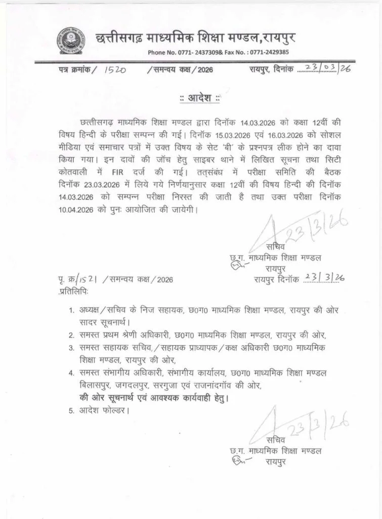 रायपुर। छत्तीसगढ़ में 12वीं बोर्ड के हिंदी पेपर को लेकर सामने आए लीक के दावों के बाद बड़ा फैसला लिया गया है। माध्यमिक शिक्षा मंडल ने कक्षा 12वीं का हिंदी पेपर निरस्त कर दिया है। यह परीक्षा 14 मार्च 2026 को आयोजित हुई थी, लेकिन विवाद के बाद बोर्ड ने इसे रद्द करने का आदेश जारी कर दिया।