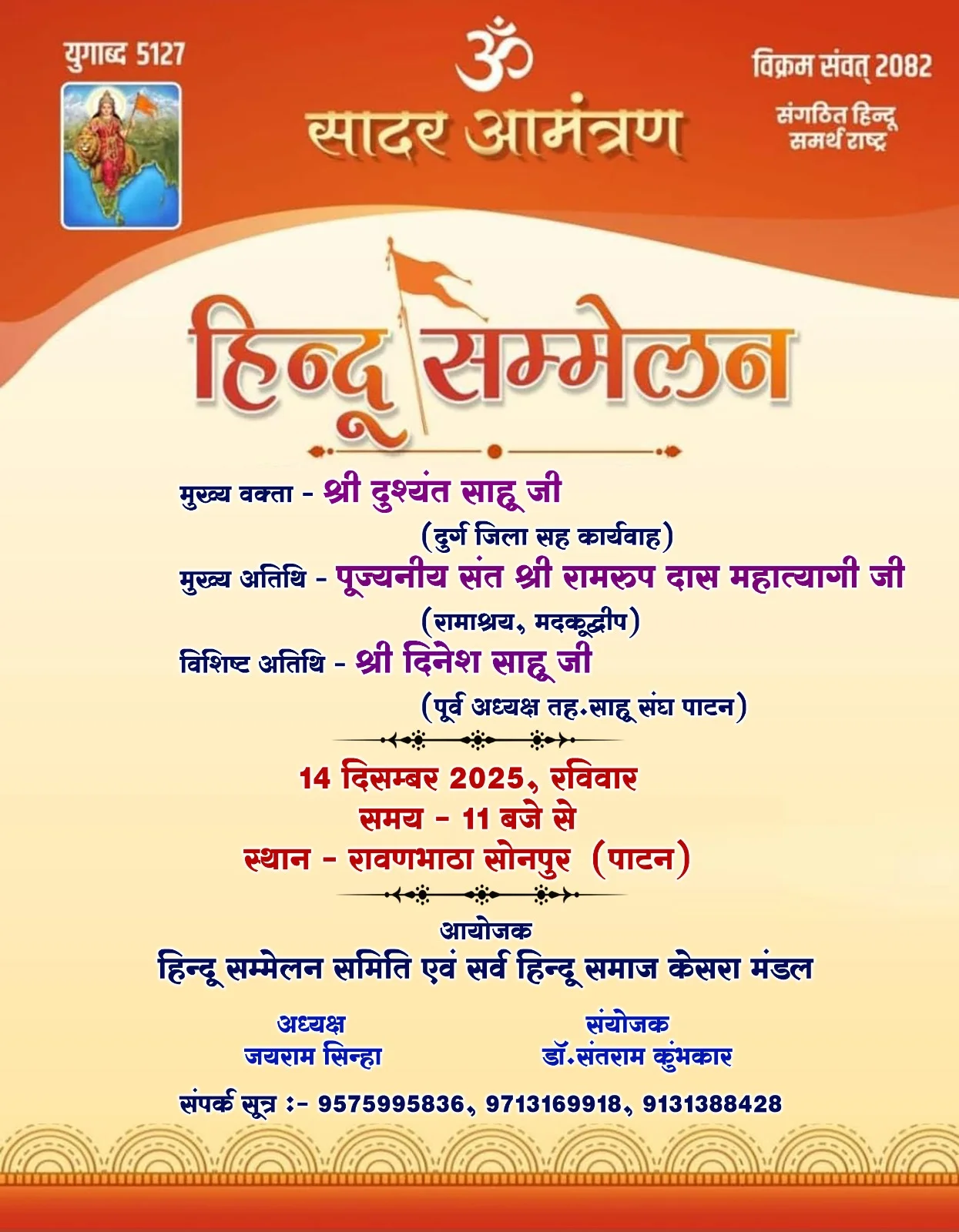 पाटन। सर्व हिंदू समाज केसरा मंडल एवं हिन्दू सम्मेलन समिति के संयुक्त तत्वावधान में 14 दिसम्बर 2025, रविवार को रावणभाठा सोनपुर (पाटन) में हिन्दू सम्मेलन का आयोजन किया जाएगा। सम्मेलन का शुभारंभ सुबह 11 बजे से होगा। आयोजकों ने बताया कि यह कार्यक्रम सामाजिक एकजुटता, सांस्कृतिक चेतना और संगठनात्मक मजबूती को समर्पित रहेगा।