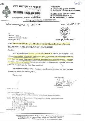 यह बताया गया कि भारत स्काउट्स एंड गाइड्स छत्तीसगढ़ ने 8 अक्टूबर 2024 को परिषद की बैठक में सभी सदस्यों की आम सहमति से राज्य के उप नियम में आवश्यक संशोधन करने के लिए प्रस्ताव पारित किया था।