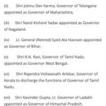 अन्य नियुक्तियों के तहत शिव प्रताप शुक्ला को तेलंगाना, जेडी वर्मा को महाराष्ट्र, नंद किशोर यादव को नागालैंड, सैय्यद अता हसनैन, राजेंद्र विश्वनाथ अरलेकर को तमिलनाडु के राज्यपाल का अतिरिक्त प्रभार और तरनजीत सिंह संधु को दिल्ली का उपराज्यपाल नियुक्त किया गया है।