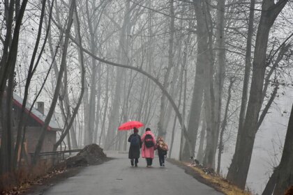 Kashmiri children walk on a cold winter morning in Ganderbal district, Indian-administered…